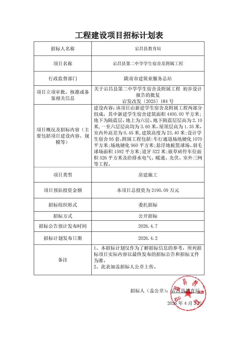 附件:宕昌縣第二中學(xué)學(xué)生宿舍及附屬工程【工程建設(shè)項(xiàng)目招標(biāo)計(jì)劃表】.pdf